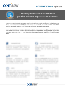Le service CONTINEW Data Hybride vous apporte le niveau de garantie nécessaire à la protection et la disponibilité des volumes importants de données grâce à la mise à disposition d’outils professionnels qualifiés et d’un suivi managé 24h/7j.